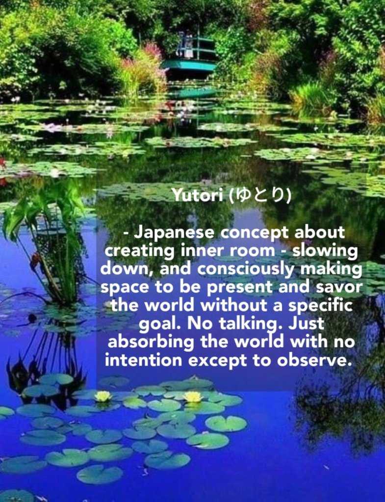 Yutori: concept japonais qui consiste à créer une pièce intérieure – ralentir et faire consciemment de l’espace pour être présent et savourez le monde sans objectifs spécifique. Sans parler. Simplement en absorbant le monde sans intention autre que celle d’observer.