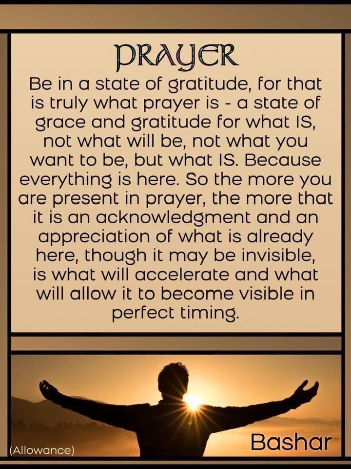 Soyez dans un état d’appréciation car c’est ce qu’est la vraie prière. un état de grâce et de gratitude pour ce qui EST, et non ce qui sera, ni ce que tu veux que ça devienne, simplement ce qui EST. Parce que tout est ici. Ainsi, plus tu es présent en prière, plus tu peux reconnaître et apprécier ce qui est déjà ici. même si c’est invisible, et c’est ce qui pourra accélérer et permettre de le matérialiser au moment juste. – Bashar