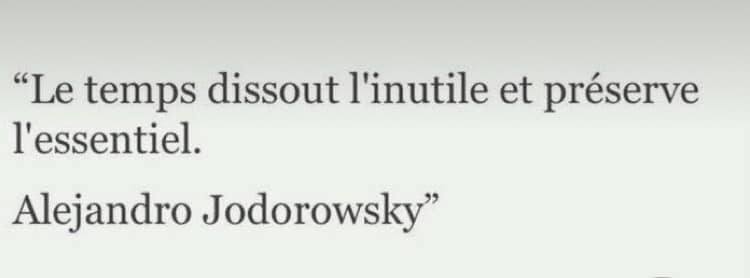 Si on accepte l’idée que le temps n’existe pas, pas vraiment, du moins pas comme on pourrait le saisir avec notre ptite tête de pinote qui compte les minutes, on peut concevoir que ce même temps – qu’il existe ou pas – dissout tout de même l’inutile et préserve l’essentiel. Selon les dires de Jodo du moins.