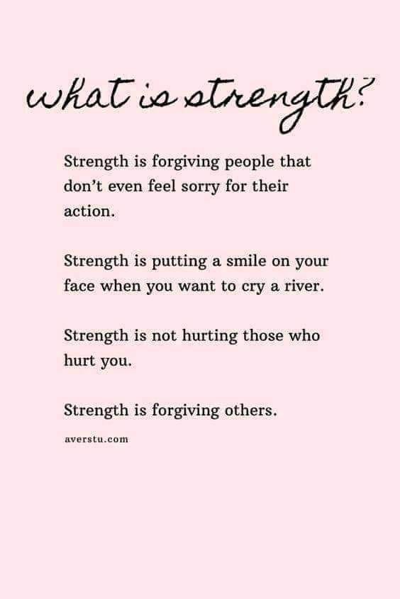 La force consiste à pardonner aux gens qui ne se sentent même pas désolé(s) face à leurs actions. La force consiste à sourire quand vous voulez pleurer à chaudes larmes. La force consiste à ne pas blesser les gens qui vous ont blessé. La force consiste à pardonner aux autres.