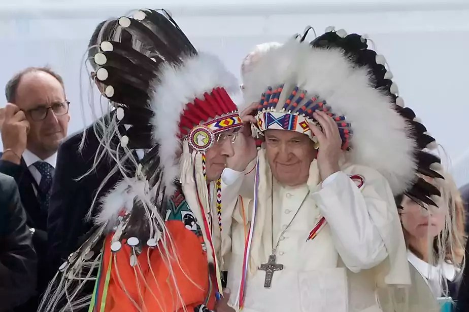 Qu’on soit blancs ou autochtones, nous percevons inévitablement l’actuelle visite du pape selon des lunettes différentes. Et ce processus d’éventrement de nos blancs de mémoire ancestraux est plus que juste et bon, il est nécessaire, inévitable, essentiel pour qu’un processus de guérison passe à une autre étape. Autant pour les premières nations que pour nous, blancs becs.
