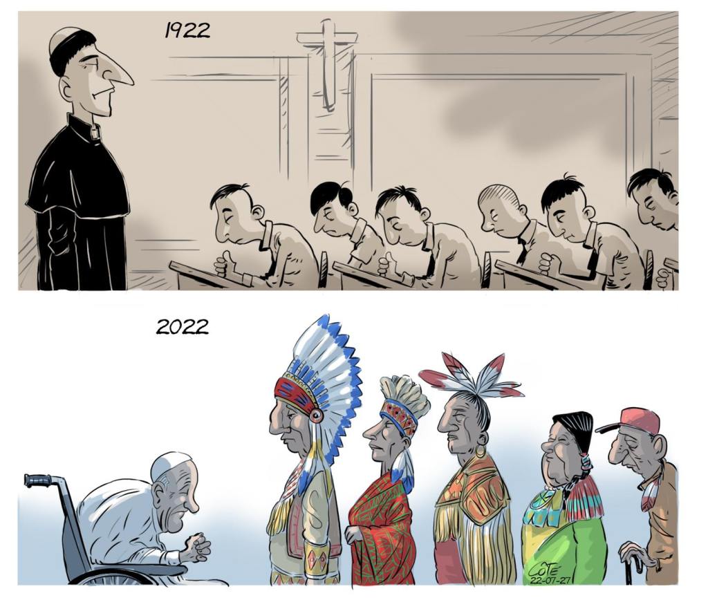 Beaucoup de souvenirs remués aussi pour toutes les premières nations du pays, et celles du monde entier aussi j’imagine car le même processus d’acculturation s’est produit un peu partout, notamment en Amérique et en Australie. J’ai d’ailleurs vu hier sur les réseaux qu’ils et elles sont nombreux aux États-Unis à se demander pourquoi le pape François ne passait aussi au sud de la frontière par la même occasion. Beaucoup à réparer pour cette institution politico-religieuse au passé plus que trouble. Le temps du Grand ménage. En espérant qu’il sera fait totalement. 2000 ans à nettoyer, un grand ménage ça.