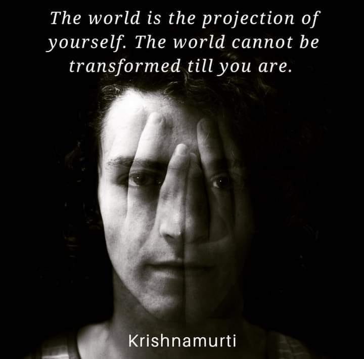 On entend souvent ce type de commentaires, soit que le monde n’est qu’une illusion, que les autres n’existent pas (Ramana), en dehors de notre perception du moins, ou que le monde n’est qu’une projection de soi-même comme l’affirme ci-haut Krishnamurti. On achète ça right ? Mais encore pourrait-on ajouter.