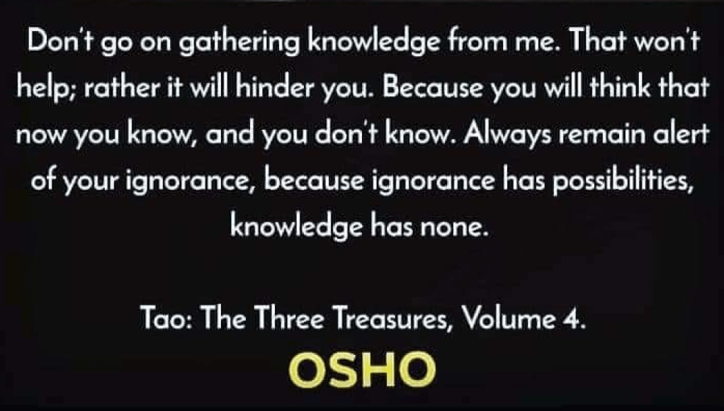 Comme Osho nous disait souvent – à part que nous sommes principalement des ignorant(e)s qui s’ignorent comme ci-haut – la connaissance n’existe pas, il n’existe que l’acte de connaître qui se déploie au quotidien. Du moins c’est ce que j’ai compris de ses mots. Il me semble que la connaissance, comme l’amour et la conscience, ne peuvent être des choses ou des concepts, ils ne peuvent que se faire verbe, et se manifester qu’au présent de surcroît. Car le passé n’est plus et l’avenir pas encore et l’amour, la conscience et la connaissance se conjuguent très mal au passé complexe ou au futur simpliste.