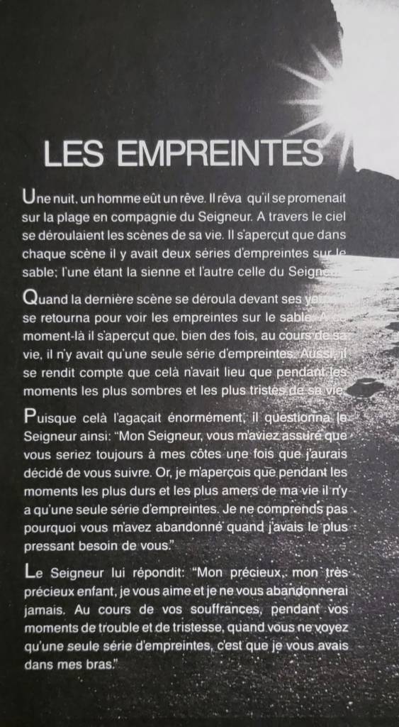 L’histoire ci-haut, un conte en fait, est riche d’interprétation. On peut y voir ce que l’on veut, ou ce que l’on peut. Car, sur ce chemin qu’est notre vie, parfois on se sent bien seul(e), abandonné(e), isolé(e), coupé(e) du reste du monde, de notre source.