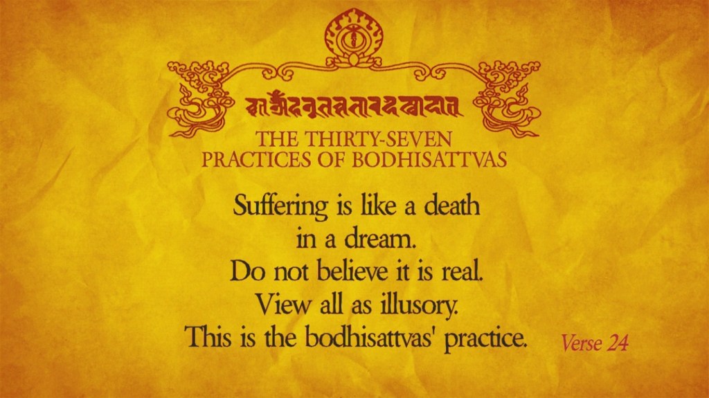 Je ne lui dirai pas non plus telle que l’avance cette affiche ci-bas que la souffrance est telle la mort dans un rêve, de ne pas croire qu’elle est réelle, ni de voir la souffrance comme une illusion.