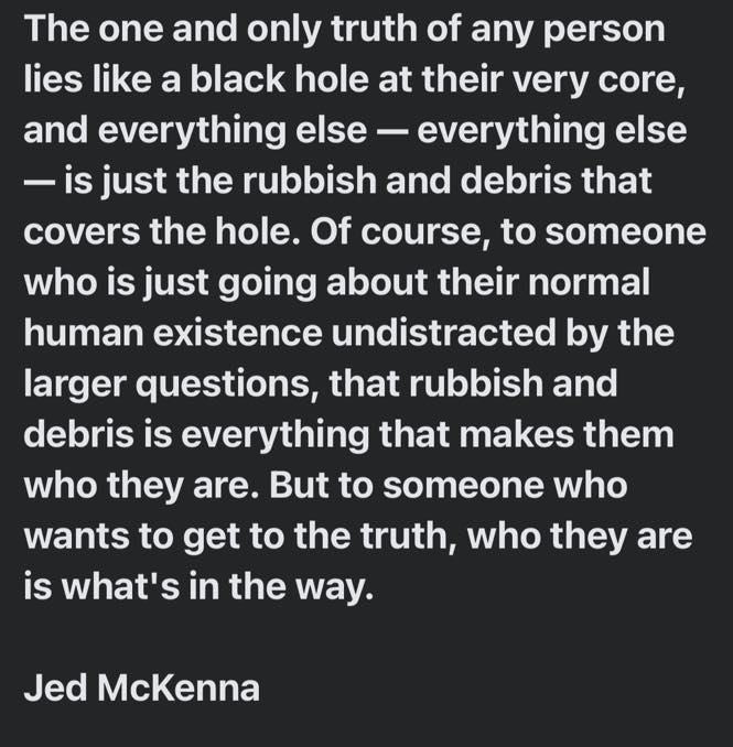Mais lorsque je suis tombé sur cette citation de Jed McKenna, mon attention a tout de suite été happée, moi captivé, et mon intérêt détourné. Et en même temps, je vois un lien certain entre le trou noir qui réside en chacun chacune au centre de nous et qui nous constitue en fait en-deça ou au-delà de notre prétendue identité, notre ou nos représentation(s) de Dieu ou du Grand Esprit et entre toute pratique religieuse. En fait ce que l’on pourrait nommer notre identification spirituelle ou religieuse.