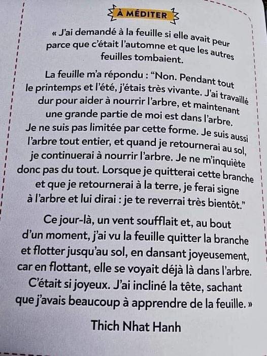 Nous sommes des feuilles et la vie, notre arbre. Soit on craint la chute, soit on se prépare à danser. Avec crainte ou confiance.
