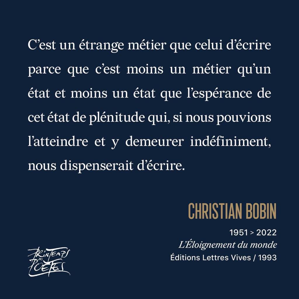 Tel que l’affirme Mr Bobin, écrire est un étrange métier, mais moins un métier qu’un état, et moins un état que l’espérance de cet état de plénitude [permanent] qui nous dispenserait d’écrire en premier lieu.