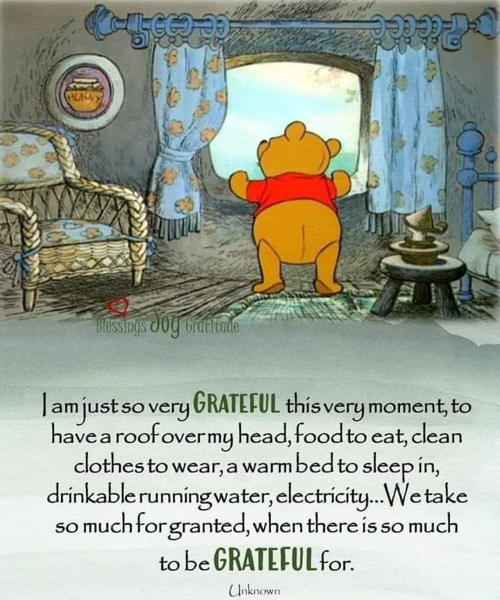 Appréciation pour la chance que l’on a de vivre ici. Au chaud, en paix, nourri(e) logé(e) chauffé(e), avec de l’air et de l’eau purs à respirer et boire. Avec un corps qui fonctionne malgré l’usure de temps qui nous passe dessus. Et avec la liberté de répondre du mieux qu’on peut et veut aux événements de la vie. Notre plus grande justice dit-on.