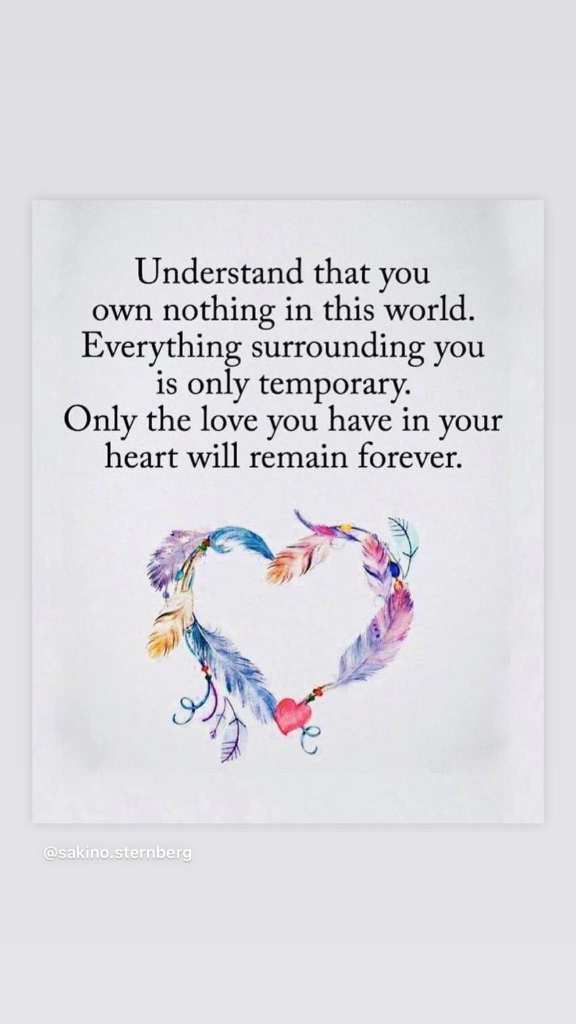 Tu dois réaliser que rien ne t’appartient en ce monde. Tout ce qui t’entoure n’est que temporaire, tout passera. Seul l’amour que tu portes en ton coeur durera pour toujours.