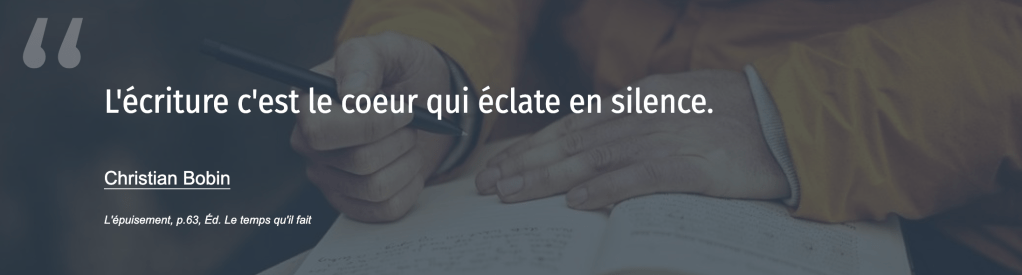 J’écris pour me vider la tête, pour aller puiser dans mon coeur, pour découvrir ce qui vit en moi et ce qui veut sortir de moi – extase littéraire – aujourd’hui. Comme les yogis utilisent leur corps, moi j’utilise mes doigts et mes mots pour demeurer flexible en esprit. En fait, pas mes mots, car comme pour la terre, rien ne nous appartient. Des mots. Nos mots. Car nous ne sommes propriétaires de rien, rien du tout ne nous appartient, nous ne sommes que des locataires, des preneurs de soin. Alors prenons soin.