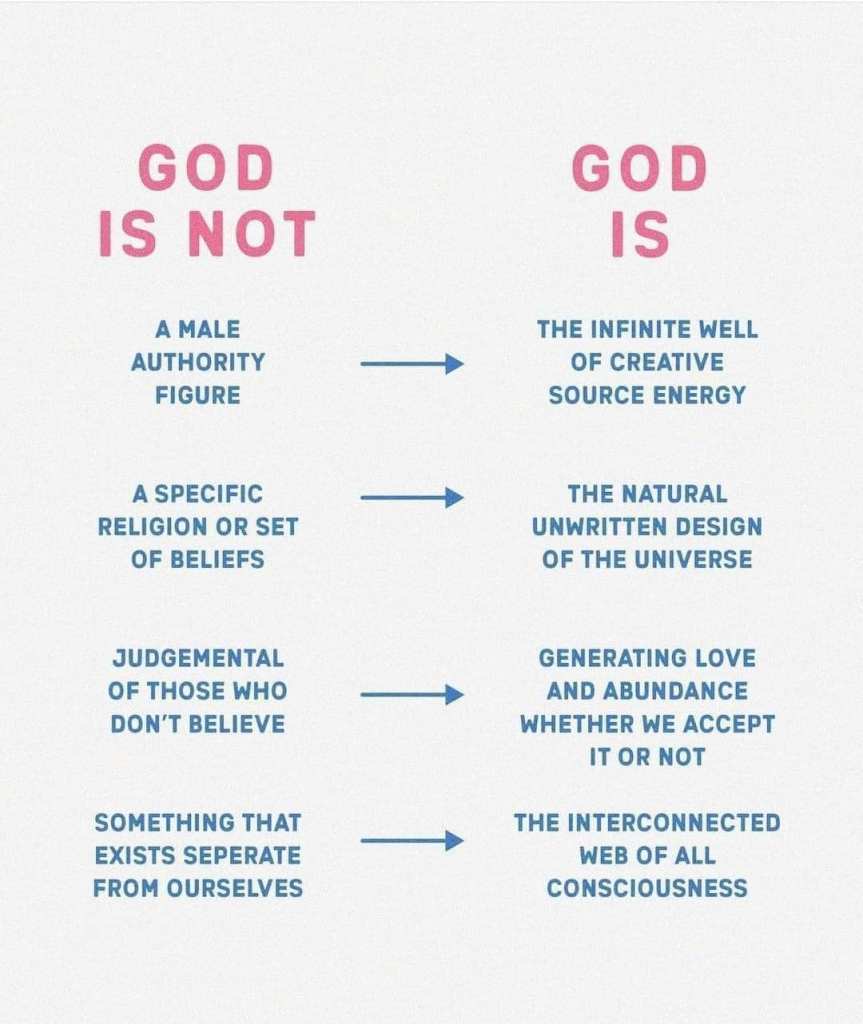 Pour moi, le mot Dieu ne désigne pas une figure d’autorité masculine, ni une religion spécifique ou une série de croyances, non plus un jugement face à ceux et celles qui ne croient pas la même chose, ni quelque chose qui existe à l’extérieur de soi, mais plutôt une source infinie d’énergie créative, un script non-écrit qui régit l’univers, une génératrice d’amour et d’abondance (que nous l’acceptions ou pas) et une toile unifiée qui intègre toute la ou les consciences.