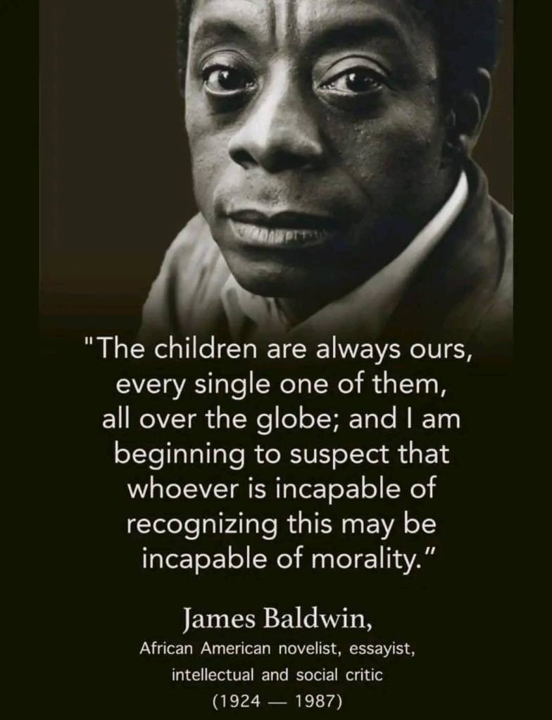 Les enfants sont tous les nôtres, chacun et chacune d’entre eux et elles, partout sur la terre; et je commence à penser que quiconque est incapable de reconnaître ce fait est incapable de sens moral. – James Baldwin