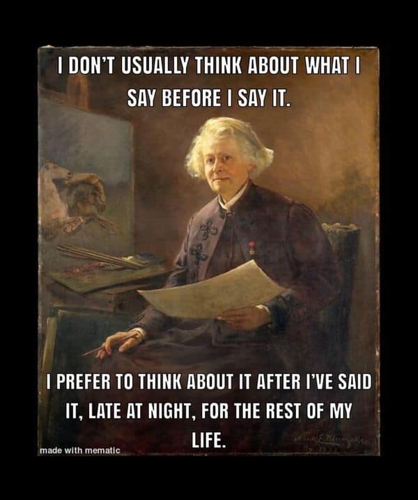 Habituellement, je ne pense pas à ce que je dis avant de parler. Je préfère y penser après l’avoir dit, , tard le soir, pour le reste de ma vie.