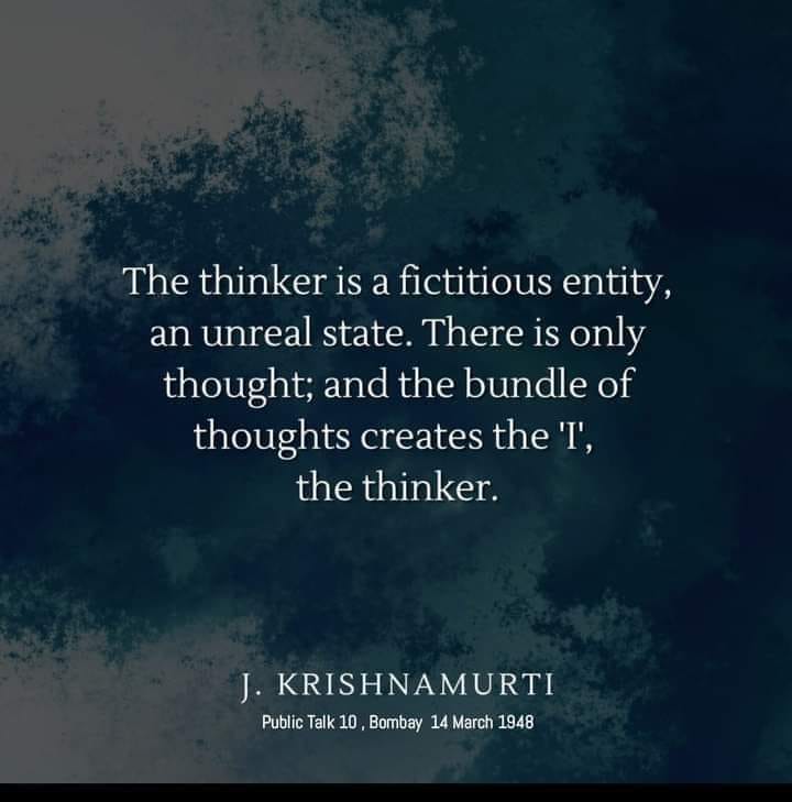 La personne pensante constitue une entité fictive, un état irréel. Il n’existe que le processus de la pensée et la somme des pensées crée le JE, le/la penseur(e). – Krishnamurti