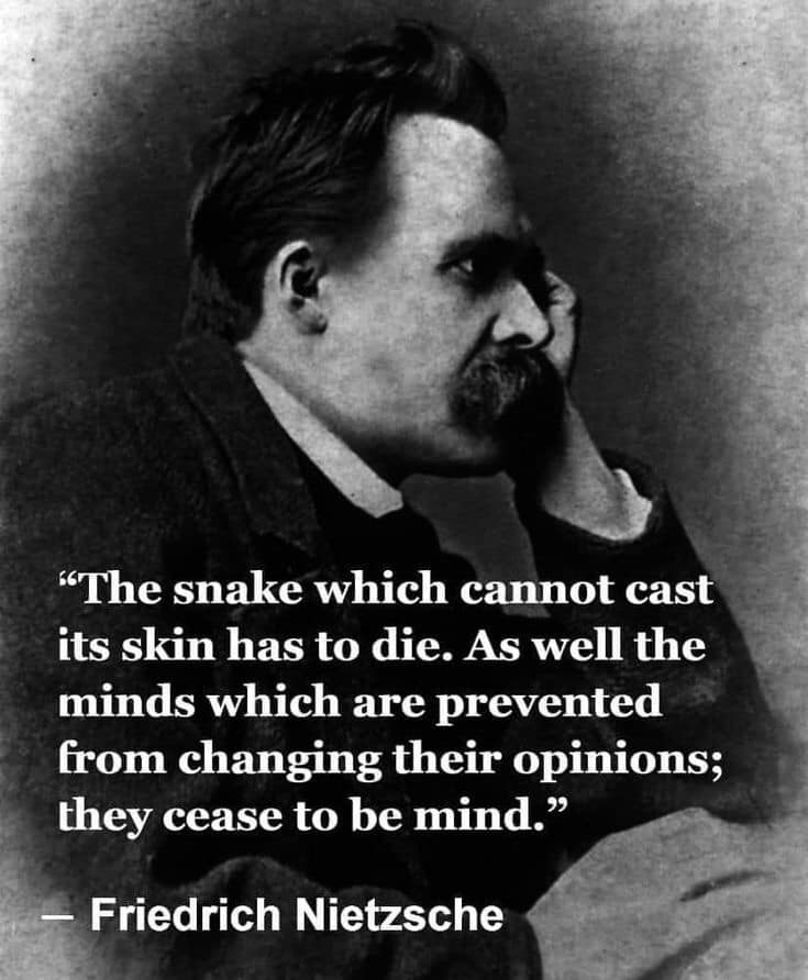 On doit apprendre à concevoir le monde selon divers points de vue, pour ne pas rester pris dans la rigidité, ni prisonnier/ère d’une seule position, ne pas se rigidifier. Car ce qui ne plie pas casse, ce qui ne change pas meurt. Comme l’affirme Nietzsche, le serpent qui ne peut laisser aller sa vieille peau va mourir, pris dans la vieille, prisonnier de celle-ci.