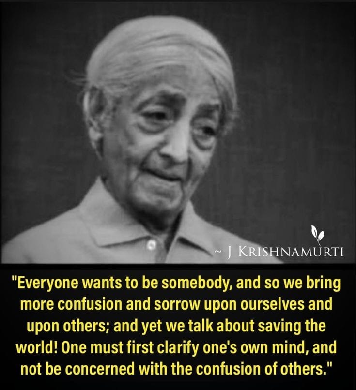 Tout le monde veut être quelqu’un, alors nous ne faisons qu’ajouter confusion et douleur en nous, comme chez les autres; et pourtant nous pensons sauver le monde ! On doit tout d’abord clarifier son propre esprit et ne pas s’occuper de la confusion des autres.