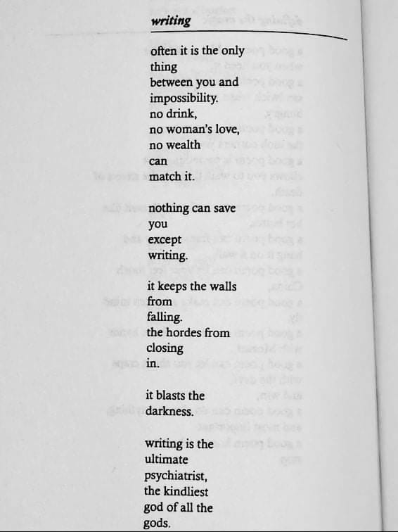 est souvent la seule chose qui te sépare de l’impossible… aucune boisson, l’amour d’aucune femme, aucune richesse ne peut l’égaler… rien ne peut te sauver à part écrire… ça permet aux murs de ne pas tomber, aux hordes de ne pas t’écraser… ça fait éclater la noirceur… écrire représente l’ultime Dieu parmi tous les Dieux…