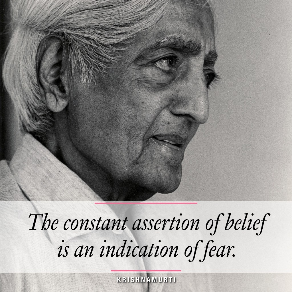 En général, on nous dit qu’on doit éviter d’entretenir et de nourrir les croyances, qui ne seraient que des idées sans fondements qu’on choisit de croire réelles et qui, selon Krishnamurti, ne sont qu’une signe de peur quand on insiste trop à croire.