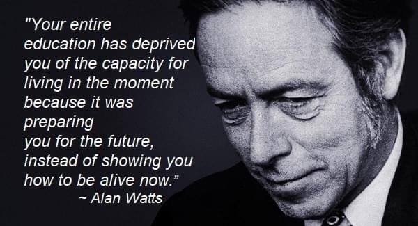 En effet Mr Watts, on ne nous a jamais enseigné à vivre le moment. Dès notre plus jeune âge, on doit apprendre à prépare son avenir, à savoir ce que l’on va faire quand on va être grand et grande. Mais la joke c’est qu’on est jamais grand ni grande, car on finit par rapetisser et redevenir un enfant.