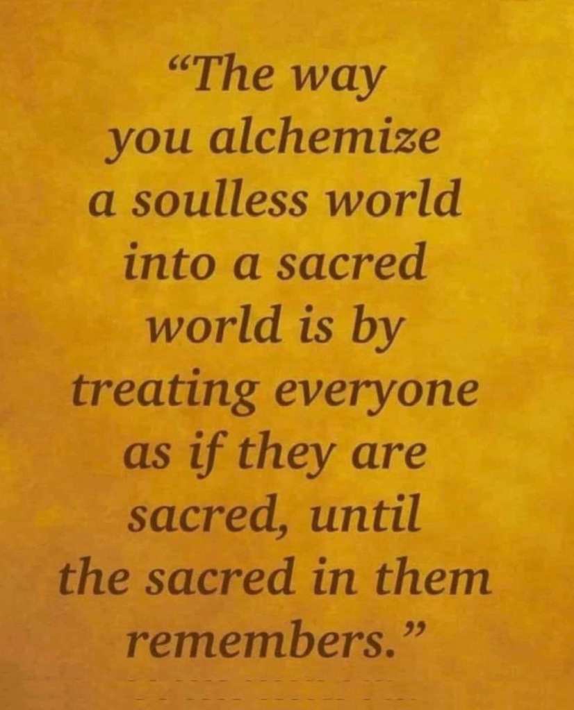 La façon de transformer un monde sans âme en un monde sacré consiste à considérer chaque personne comme un être sacré, jusqu’à ce que le sacré en eux/elles s’en souvienne.