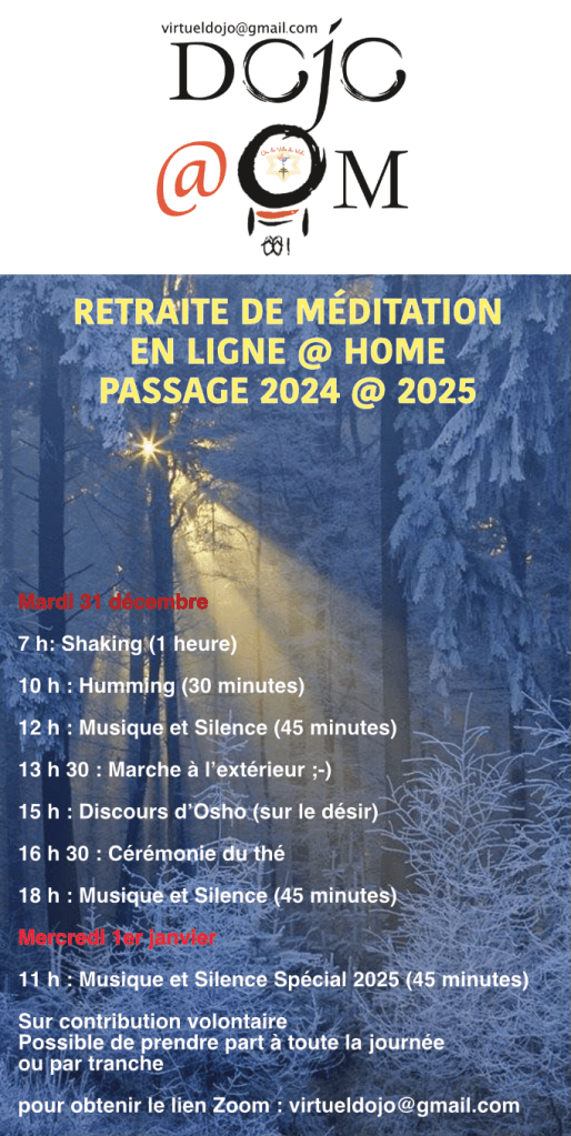 Et le 31, je vais méditer en mon home, en digne ligne, avec quelques-un(e)s de vous qui le voudrez bien. Ensemble, et tout et tous et toutes seul(e)s. Comme toujours. À tout jamais. Par amour.