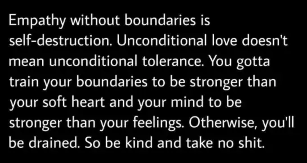 L’empathie sans frontières mène à l’auto-destruction. L’amour inconditionnel ne signifie pas tolérance inconditionnelle. Vous devez vous arranger pour que vos frontières soient plus fortes que la tendresse de votre coeur et votre mental plus fort que vos sentiments. Sinon vous serez épuisé.e. Alors soyez bon.ne mais n’acceptez pas n’importe quoi.