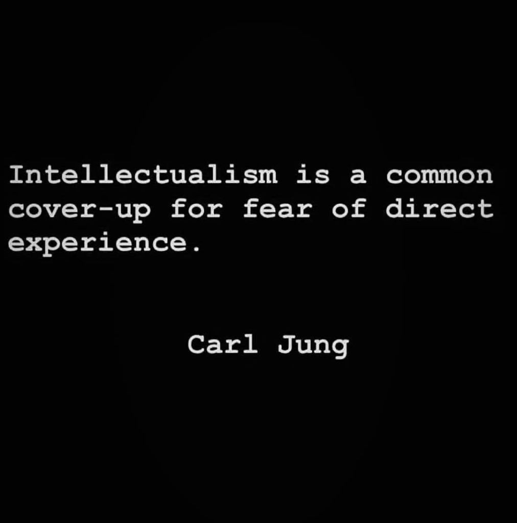 Intellectualiser et se dire que tout est parfait car c’est ainsi que les gens et les choses sont et que l’humanité a encore besoin de cela. Mais comme nous le dit Jung, l’intellectualisation n’est souvent qu’une façade masquant une expérience vive et directe.
