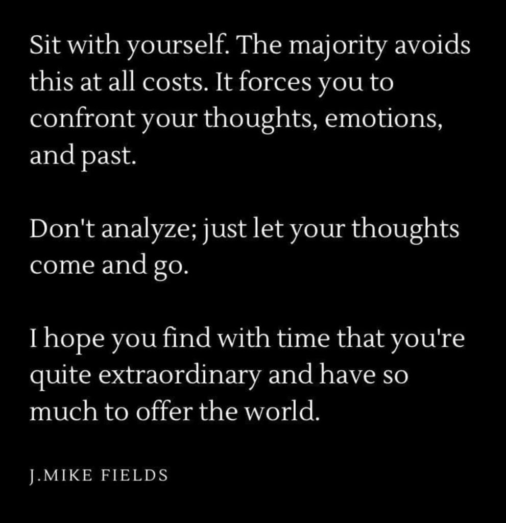 Assis-toi. seul.e. avec toi-même La majorité des gens évitent cela à tout prix. Car ça nous force à confronter nos pensées, nos émotions et notre passé. N’analyse pas: ne fais que laisser passer tes idées. Et j’espère qu’avec le temps, tu réalises que tu es extraordinaire et que tu as tant à offrir au monde. – J. Mike. Fields