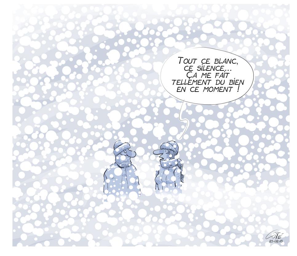 45 cm de blanc silence nous est tombé dessus d’un coup, pour le plus grand bien de nos oreilles, de nos yeux et de notre âme. À condition de fermer nos écrans aussi. Car ça n’arrête pas dans toutes les sphères. Et on vit beaucoup à-travers les yeux ces temps-ci.