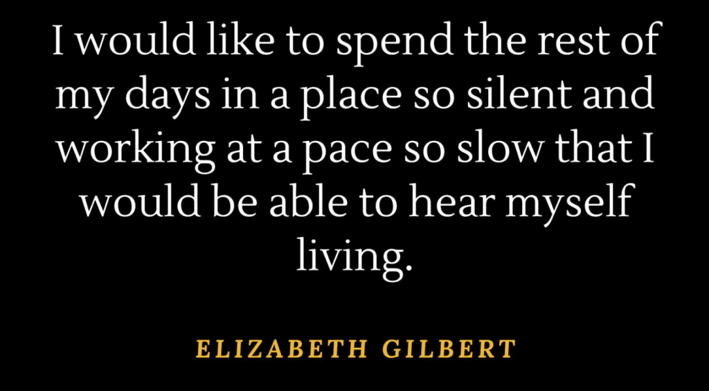 Elizabeth Gilbert le dit bien ici-bas: j’aimerais vivre le reste de mes jours dans un endroit si silencieux et travailler à un rythme si lent que je serais capable de m’entendre vivre.