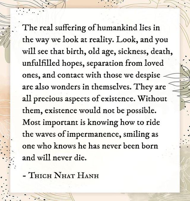 Pas que Jung qui le dit, Thich Nhat Hahn aussi : la réelle souffrance humaine réside dans la façon dont nous regardons la réalité. Regardez et vous verrez la naissance, la vieillesse, la maladie, la mort, les espoirs non comblés, les séparations des êtres aimé.e.s, comme les relations avec des gens qu’on déteste sont aussi des sources d’émerveillement en soi. Ce sont tous de précieux aspects de l’existence. Sans eux, l’existence ne serait pas possible. Ce qui est primordial consiste à surfer sur les vagues de l’impermanence, souriant au fait que nous ne sommes jamais né.e.s et que nous ne mourrons jamais.