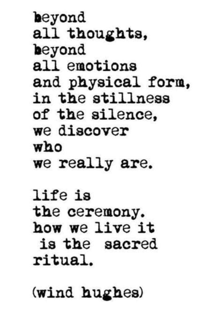 Além de todos os pensamentos, além das emoções e da forma física, na quietude do silêncio, descobrimos quem somos… a vida é uma cerimônia e a maneira como a vivemos é o ritual sagrado.