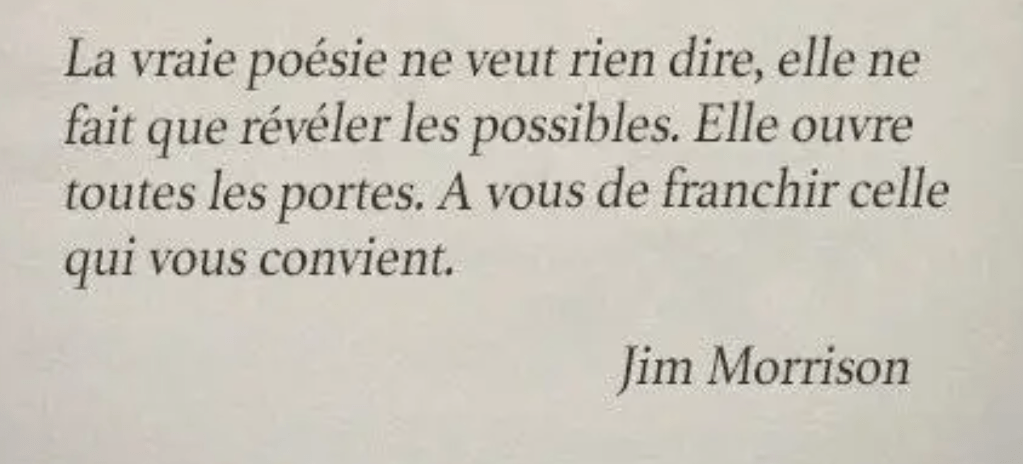La poésie se veut une invitation de mots, une invitation mise en mots. On utilise les mots pour nous faire voyager, pour nous extasier – nous faire sortir du petit soi incarné et enfermé dans le corps de nos croyances limitées ou pour nous faire s’éclater et percevoir plus grand que soi, c’est selon. Merci Jim, belles portes grandes as-tu ouvert.