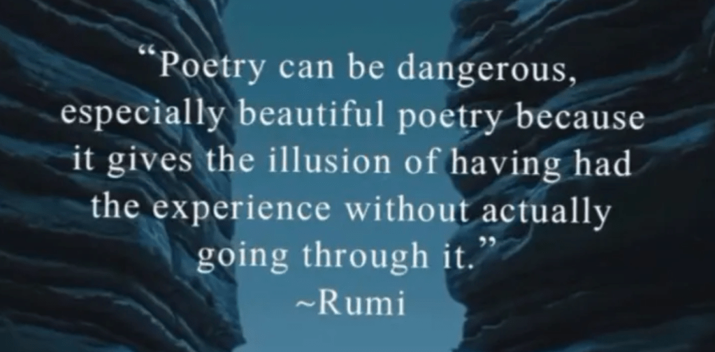 Le second meme, qui serait de Rumi (mais on lui en attribue plusieurs à lui il me semble) se traduirait ainsi : La poésie peut être dangereuse, en particulier la belle poésie car elle crée l’illusion d’avoir vécu l’expérience sans vraiment être passé au-travers.