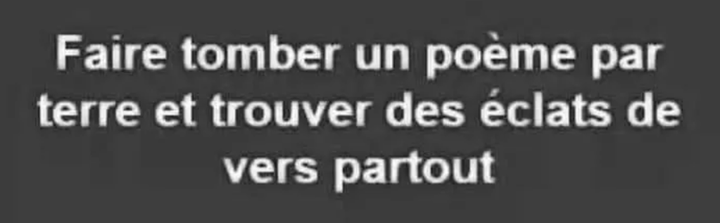 Et on voit littéralement se répandre les éclats de vers, comme des éclats de verre. Rien à faire, la scène s’image devant nos yeux et s’imagine en notre tête alors que le plancher se poétise de bouts de vers. Le Ver, à moitié plein, dit le vide. Verdict ?