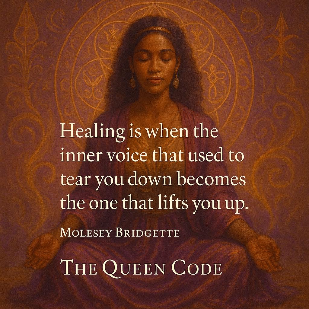 Comme le dit ci-bas Molesey Bridgette dans le Queen Code : la guérison se produit quand la voix intérieure qui nous démolissait jadis devient celle qui nous nous élève et nous permet d’avancer.