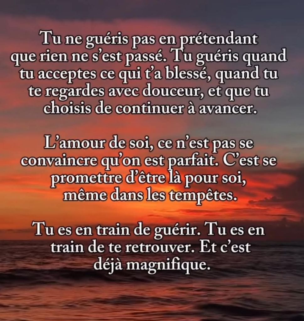 Et tout au long de notre existence, on doit apprendre à faire la paix avec ce qui nous est arrivé, apprendre à guérir, à maturer avec ce matériau reçu et parfois imposé contre notre gré. Certaines expériences sont plus difficiles que d’autres à accepter et à intégrer, ou plus longues à faire siennes, pour éventuellement, peut-être dans le meilleur des cas, pouvoir reconnaître leur richesse.