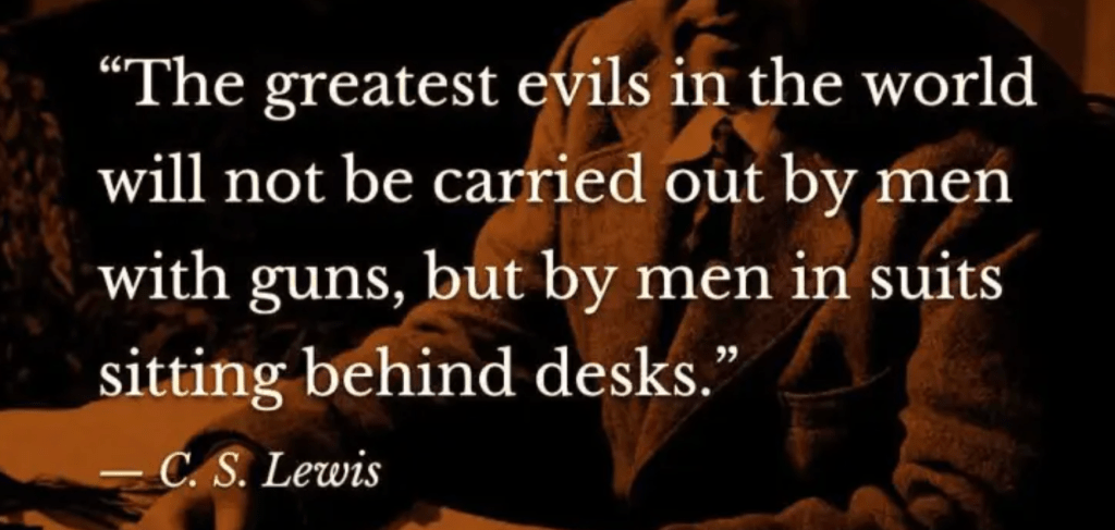 En effet, tel que l’avance C.S. Lewis, les pires maux de ce monde ne sont pas portés par les hommes avec des fusils, mais par des hommes en habits assis derrière des bureaux. Des hommes qui n’iraient jamais se battre eux-mêmes, ni leur famille. Ils préfèrent envoyer les fils et les filles des autres.