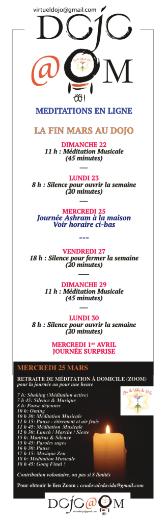 Nous sommes quelques-un.e.s à vraiment apprécier ces rencontres du 3 ème type. Parfois, nous prenons une journée complète pour transformer nos maisons respectives en Ashram, en Dojo, en monastère. Tel qu’on le fera mercredi prochain. Une journée sans nouvelles, une journée de repos total.