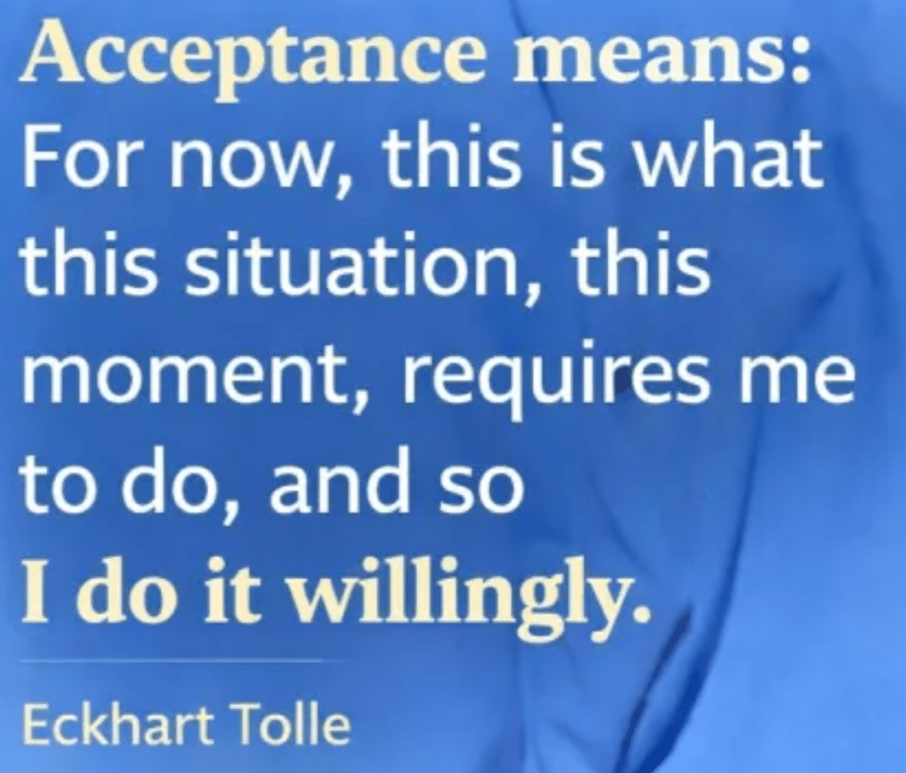 L’acceptation qui se définit ainsi selon Eckhart Tolle: Pour le moment, telle est la situation, ce moment qui m’incite à faire ce que doit. Et je le ferai volontairement.