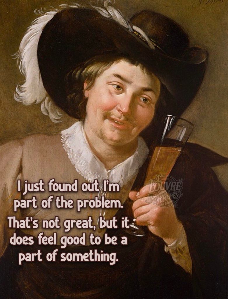 Quand on fait partie du problème, c’est pas terrible comme qu’y dit, mais on peut au moins agir sur son ptit bouttt à soi. Bien sûr ça ne règlera pas le sort du monde, mais ça peut nous permettre d’observer plus paisiblement, un peu plus détaché.e. Que chacun commence par son ptit bout de trottoir et la suite devrait rouler pas pire.