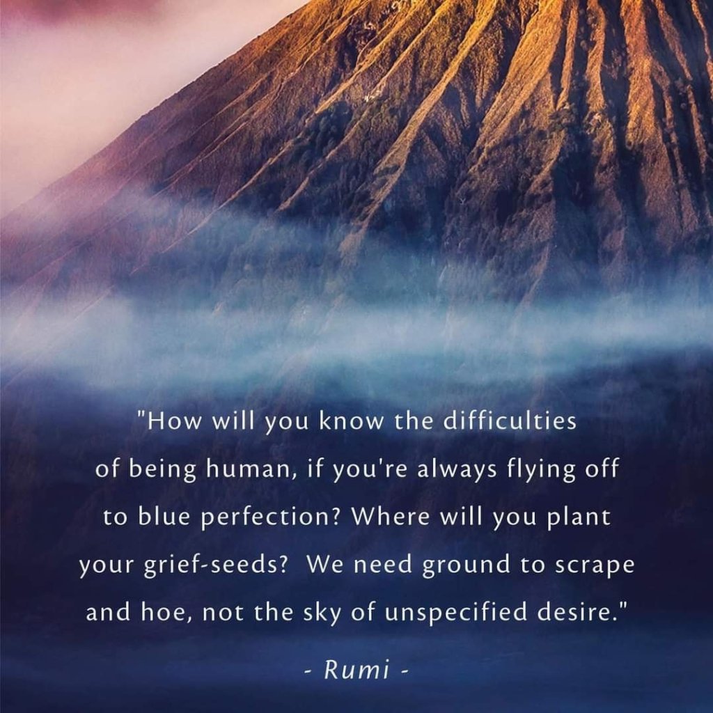 Comment connaitras-tu les difficultés d’être humain.e si tu tentes toujours de t’évader vers le mirage de la perfection ? Où sèmeras-tu les graines du chagrin ? Nous avons besoin de terreau pour gratter et semer, pas d’un ciel de désir indéterminé. – Rumi