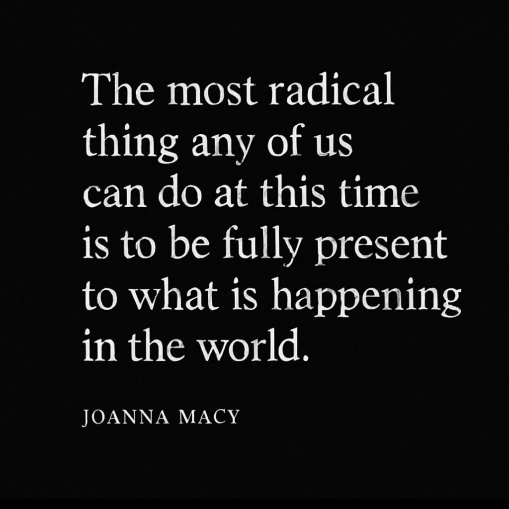 La chose la plus radicale que l’on puisse faire à l’heure actuelle consiste à être totalement présent.e à ce qui se passe dans le monde. – Joanna Macy via Alain Nyala