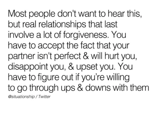 La plupart des gens ne veulent pas entendre ceci, mais les relations vraies qui durent requièrent une grande dose de pardon. Vous devez accepter le fait que votre partenaire n’est pas parfait.e et, inévitablement, vous blessera, vous décevra et vous dérangera. Vous devez décider si vous voulez vivre ces hauts et ces bas ensemble.