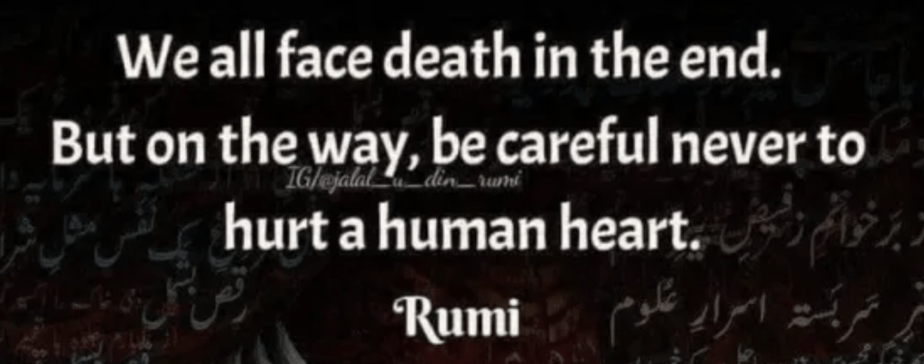 Au final, nous faisons tous/tes face à la mort. Mais en chemin, prenons soin de ne jamais blesser aucun coeur humain. – Rumi