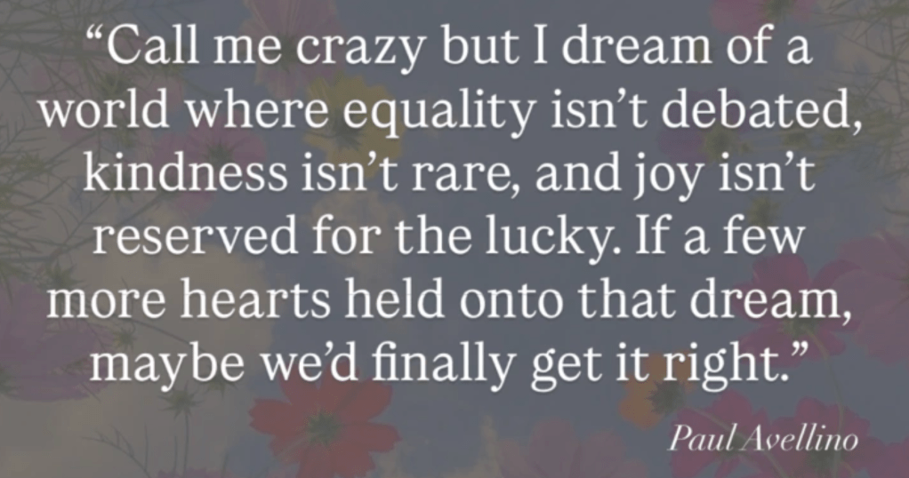Traitez-moi de fou mais je rêve d’un monde dans lequel l’égalité n’est pas mise en cause, un monde dans lequel la bonté n’est pas rare et la joie pas réservée à quelques chanceux.. Si quelques coeurs de plus tenaient à ce rêve, peut-être qu’on y arriverait.