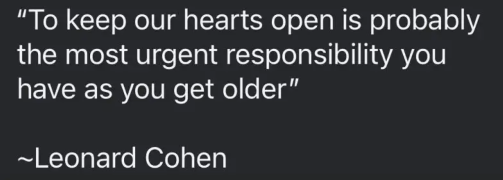 Le défi de garder nos coeurs ouverts constitue probablement la plus urgente responsabilité avec les années qui passent. – Leonard Cohen