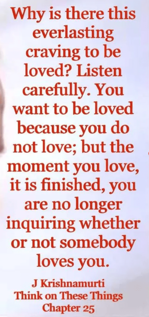 Pourquoi ce si grand besoin toujours d’être aimé.e ? Lis attentivement. Tu as besoin d’être aimé.e parce que tu n’aimes pas; dès que tu aimes, c’est terminé, tu ne cherches plus à savoir si les autres t’aiment ou pas. – J. Krishnamurti